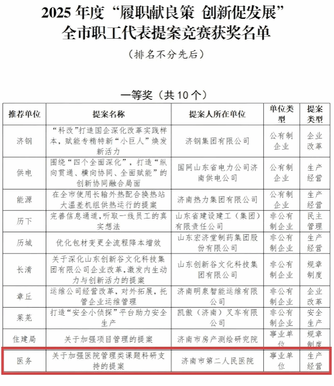 )工会提报的《关于加强医院管理类课题科研支持的提案》获评2025年“履职献良策 创新促发展”全市职工代表提案竞赛一等奖。