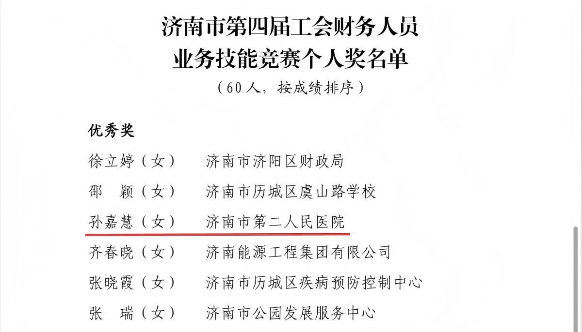 )财务科的孙嘉慧凭借扎实的业务基础及良好的现场发挥晋级决赛,并作为济南市医务工会代表队成员参加决赛。日前,决赛结果揭晓,孙嘉慧获评个人优秀奖。
