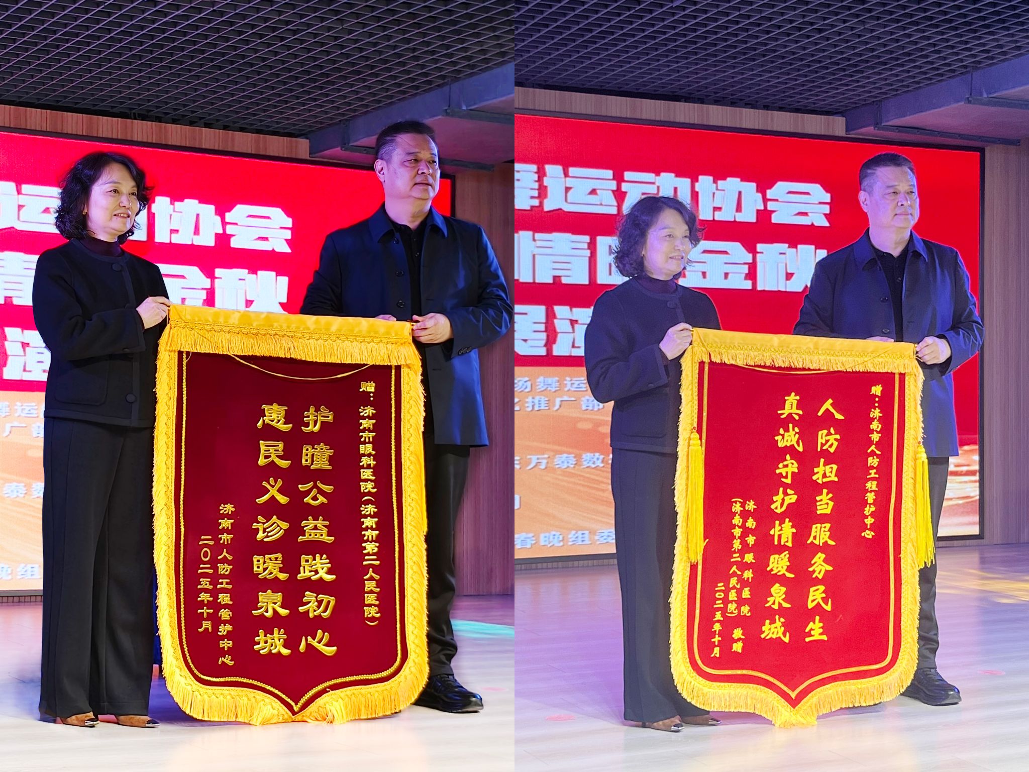 活动现场,医院志愿者登上“百姓星光聚场”,为台下观众带来了一套简单实用的“干眼操”。志愿者动作规范、讲解细致,将日常护眼小知识融入其中,让观众们在轻松愉快的氛围中学习到了实用的护眼方法,赢得了阵阵掌声。表演结束后,市眼科医院(市二院)纪委书记刘伟与市人防工程管护中心党支部书记辛绍涛互赠锦旗。这面锦旗不仅承载着双方合作的深厚情谊,更象征着共同为群众健康和社会公益事业努力的坚定决心。