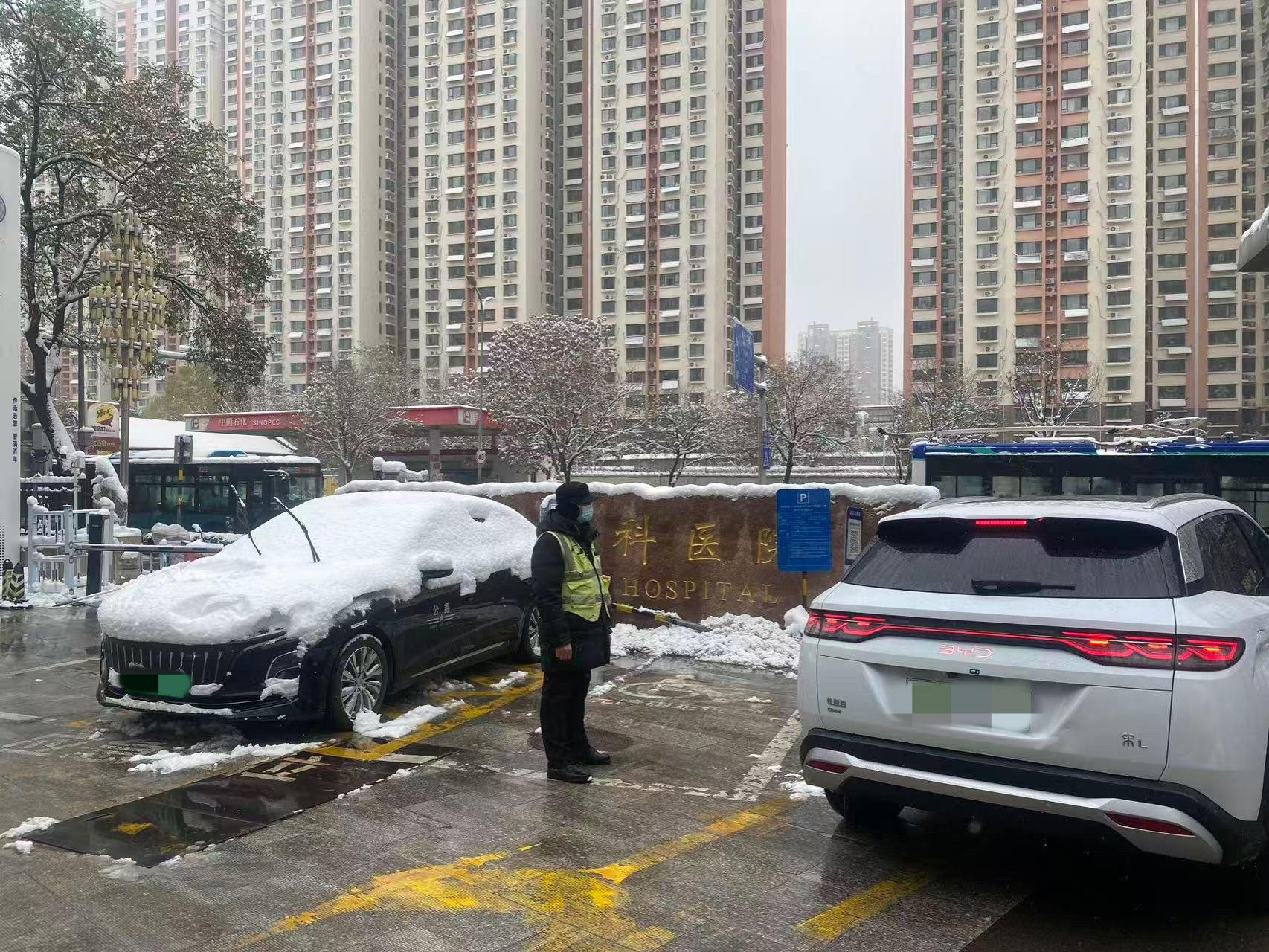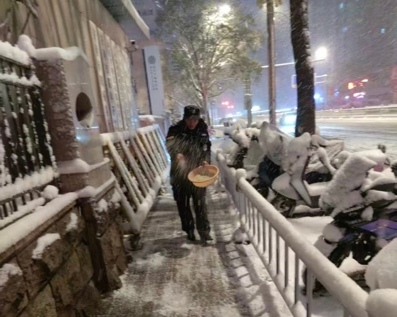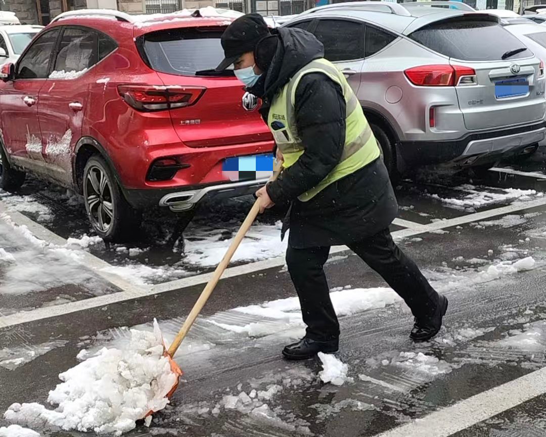 )迅速启动应急预案。12日傍晚至今晨,医院各部门工作人员连夜开展扫雪融雪行动。