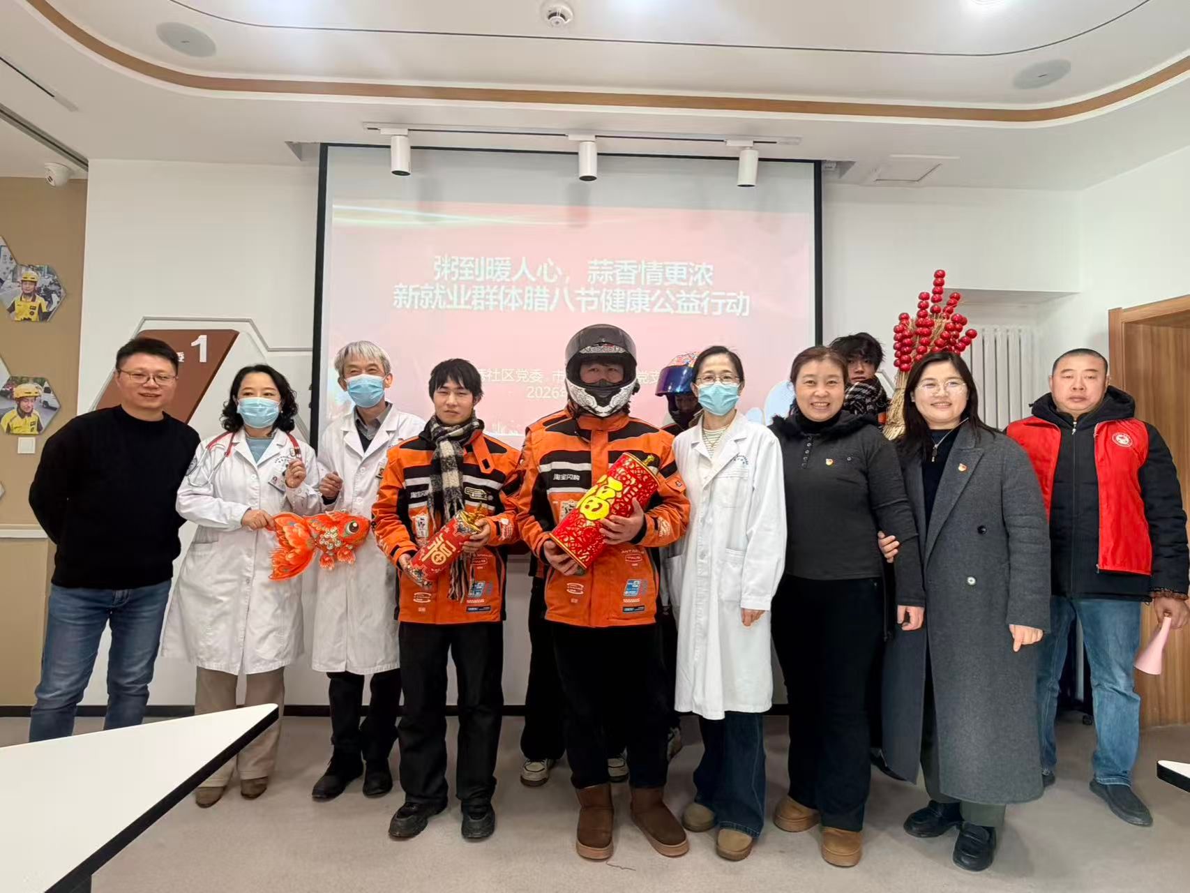 )门诊党支部组织党员医护人员走进发祥巷社区,开展了一场别开生面的“双报到”活动,为外卖小哥送上了健康关怀与节日温暖。