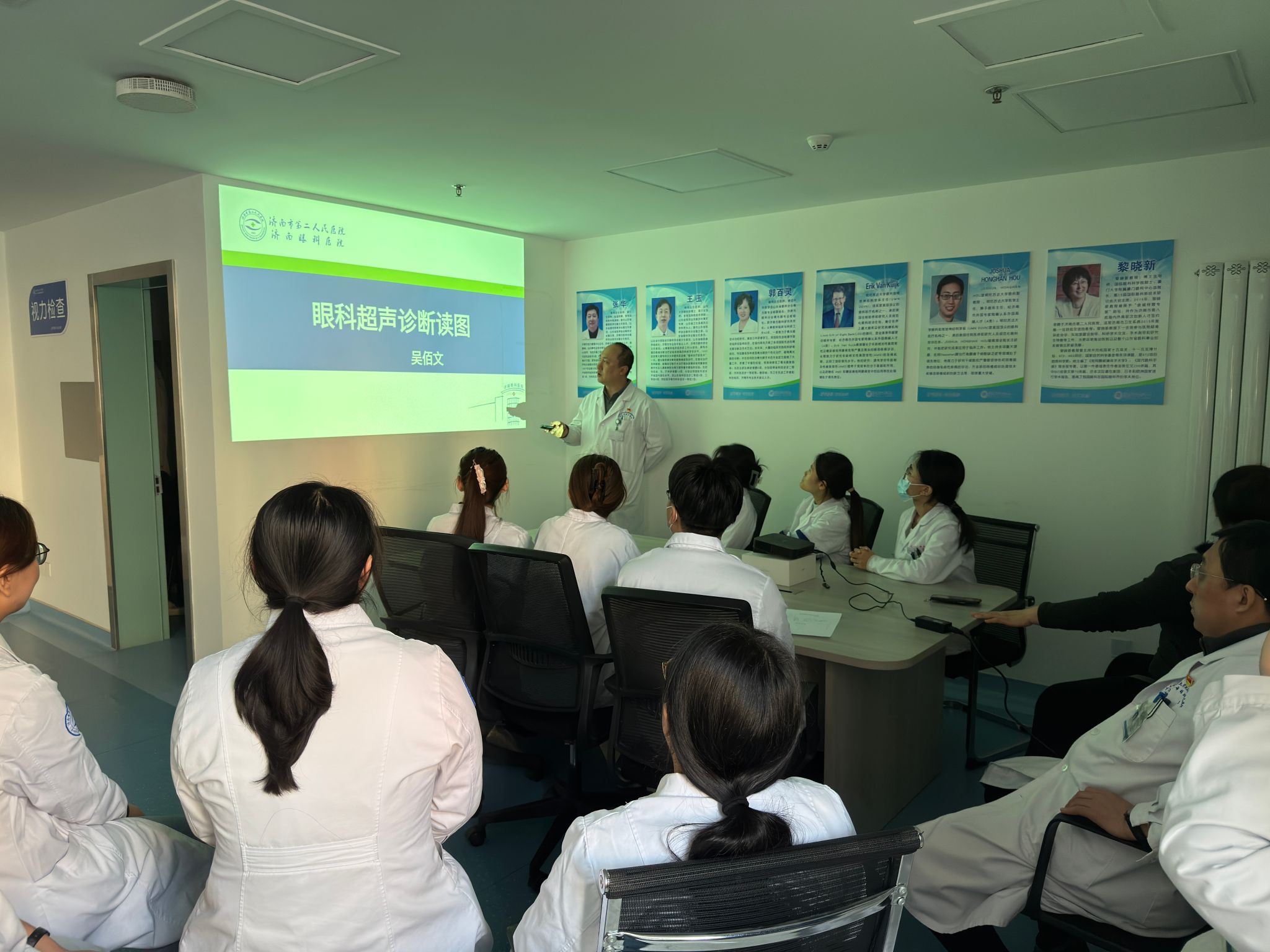 )眼科门诊VIP诊室内暖意融融、学风浓厚,门诊党支部“‘以课赋能,争当先锋’中青年党员业务提升行动”首讲圆满开讲。门诊支部委员、眼科特检科业务骨干及实习学生齐聚一堂。
