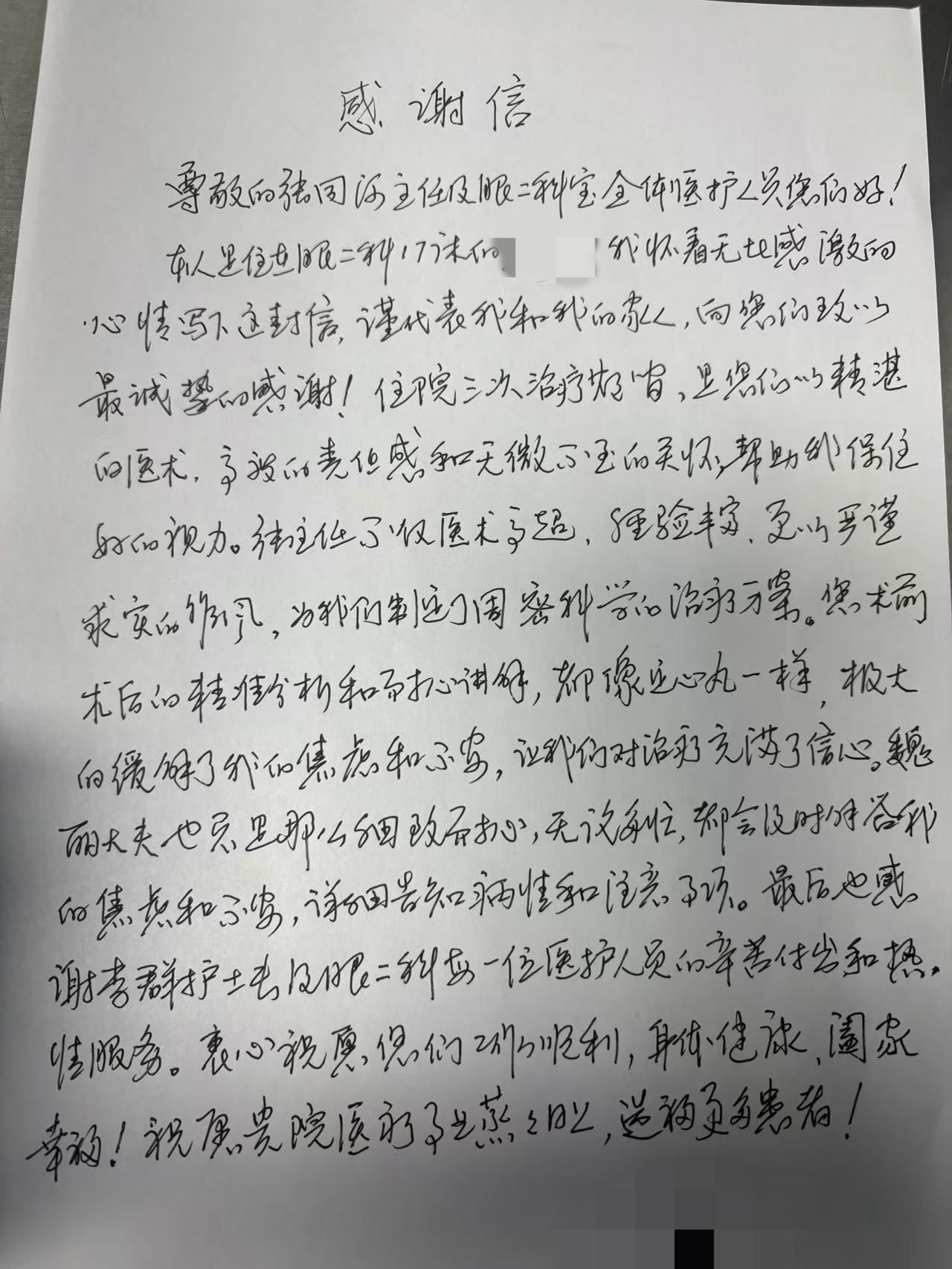)眼二科(眼底病专业)的病房里,这封饱含深情的感谢信,为她跨越半年、历经三次住院的求医之路,画上了圆满而温暖的句号。从突发眼底出血致生活失能,到视网膜脱离的急速救治,再到硅油取出与人工晶体植入的精细修复,眼二科医护团队以专业与温情,为这位高危眼疾患者重燃光明希望。