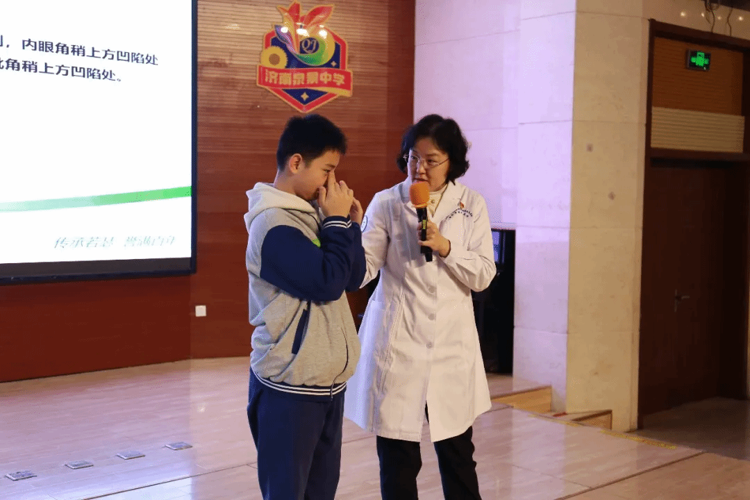 此外,宿主任强调定期检查视力的重要性,以便及时发现视力问题并采取相应措施。随后,为了让同学们更好地掌握眼保健操这一日常护眼方法,宿主任现场进行了标准示范,详细讲解每一个穴位的准确位置和按摩手法。她还邀请同学们上台互动,手把手地纠正动作,确保大家都能掌握正确、有效的眼保健方法。同学们积极参与,现场气氛热烈。