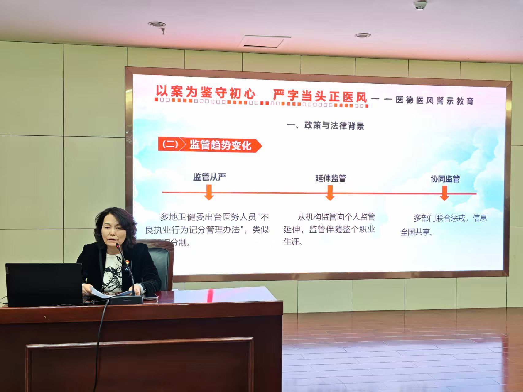 党课上,刘伟书记系统解读了当前医疗行业最新监管政策与法规体系,结合行业特点,分类剖析了推销医疗产品、医保诈骗、过度诊疗、泄露患者隐私、收受医药回扣等10余起典型违规违纪案例。深入剖析了此类违规行为背后的思想滑坡、制度漏洞和管理短板等根源,明确指出当前医德医风建设已从机构层面监管向个人行为监管延伸、多部门协同惩戒的从严趋势,并着重强调了五项警示要点,为全体参会人员敲响廉洁行医警钟。