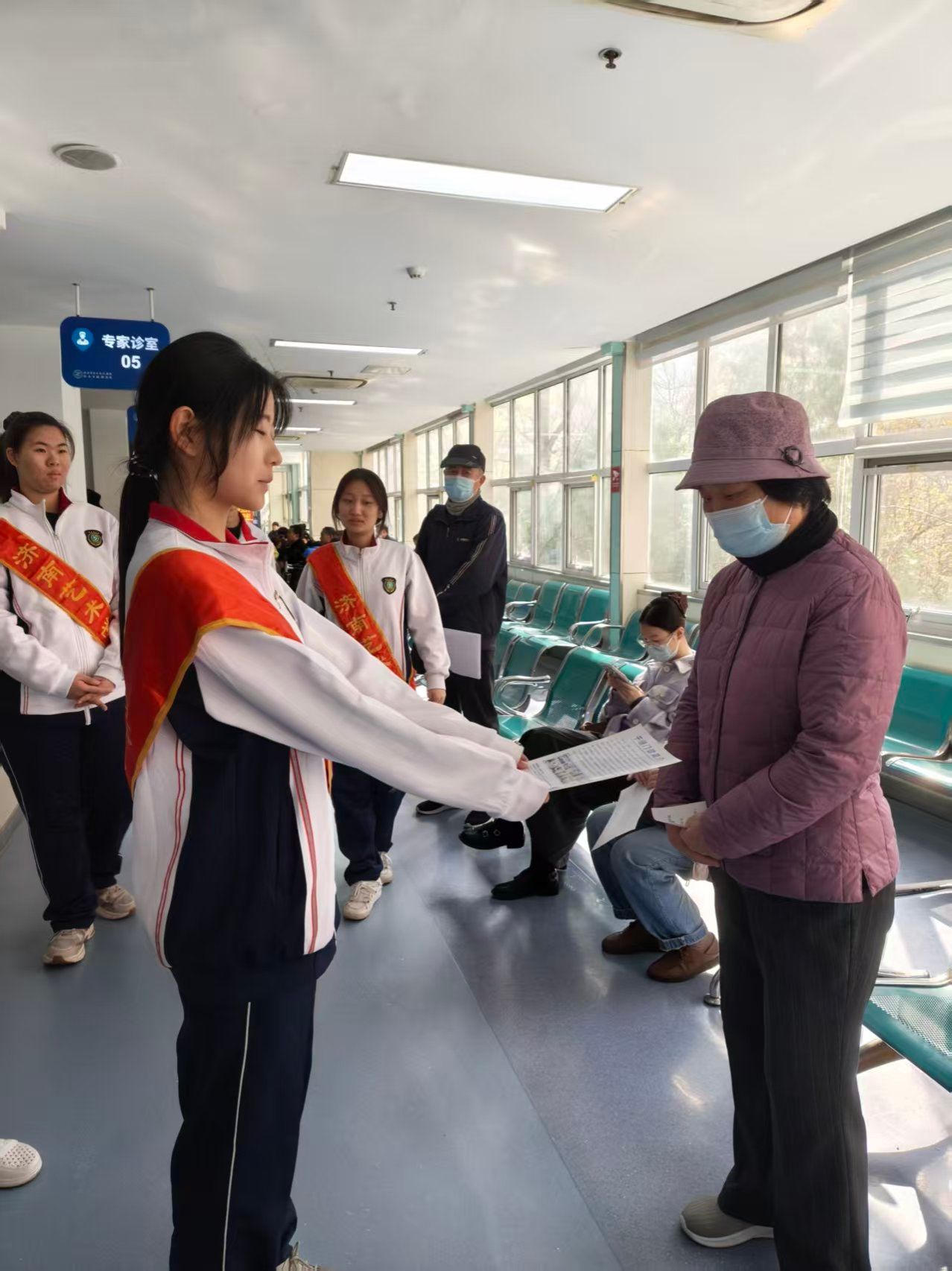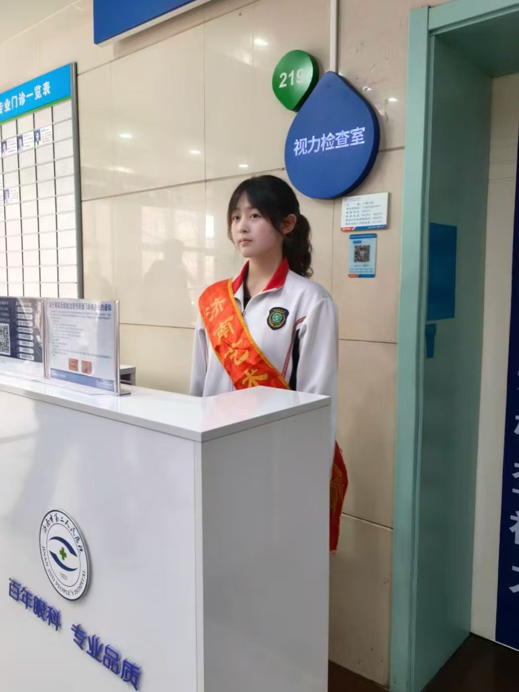 活动现场,在医院青年医护志愿者的指导下,济南艺术学校的学生志愿者们迅速进入岗位。在干眼门诊与眼科门诊区域,志愿者们化身“健康宣传员”,用通俗易懂的语言向就诊患者及家属讲解干眼成因、日常护眼、科学用眼等知识,发放护眼宣传资料,帮助大家提升眼健康防护意识。同时,志愿者们积极参与门诊导诊服务,主动引导患者挂号、候诊、检查,协助维持就诊秩序,让就医流程更顺畅、更暖心。医护人员与学生志愿者携手同行,将专业医疗服务与青春志愿力量相结合,既让患者感受到贴心的医疗关怀,也让同学们在实践中体会医者担当、践行志愿初心。