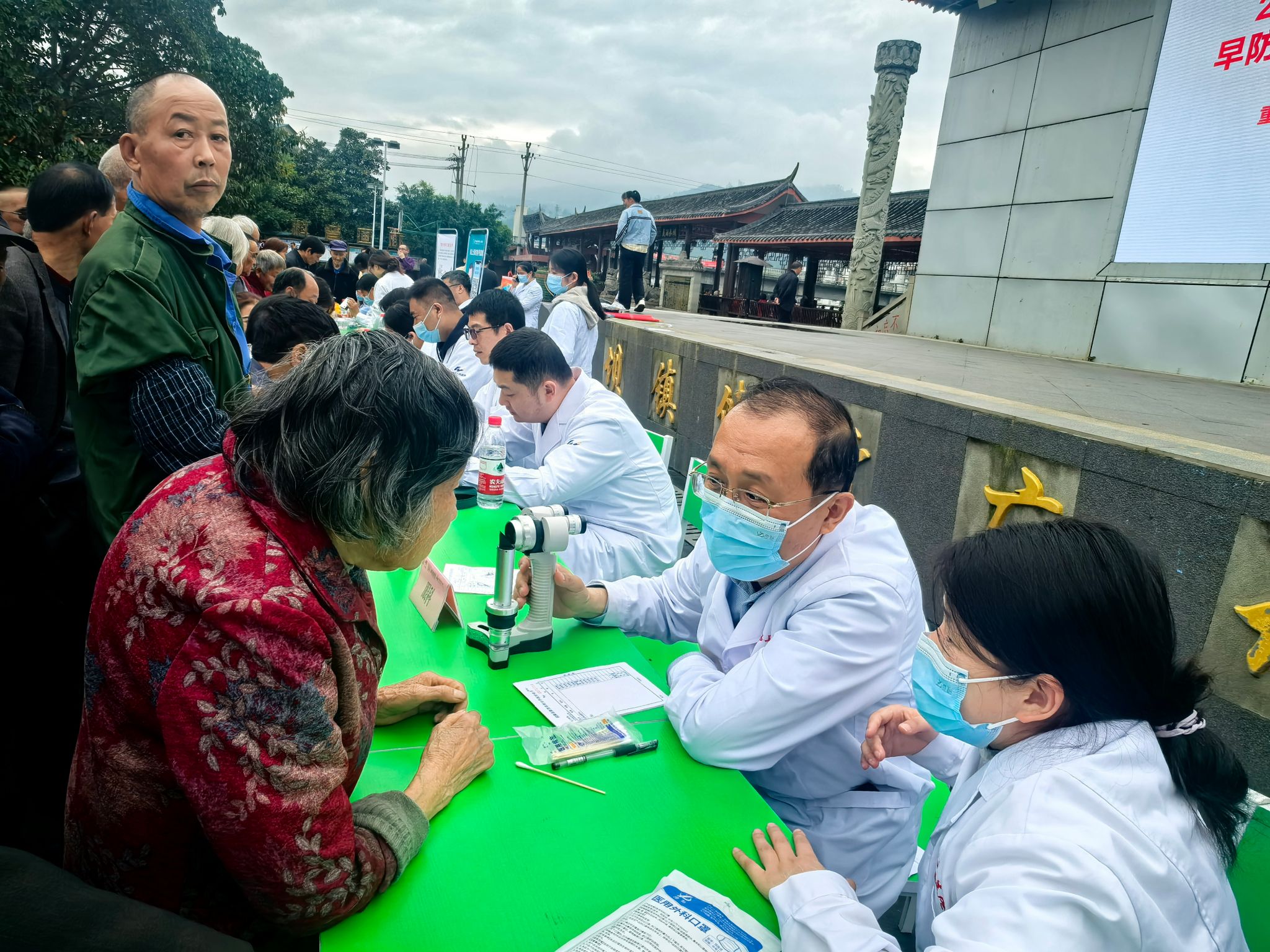 义诊开始后,韩旭光主任耐心细致地为每一位群众检查眼睛,不放过任何一个细微的症状。由于当地老年人大多讲方言,沟通上偶尔需要反复确认,韩主任不急不躁,一边用手势比划,一边放慢语速反复解释,直到对方听明白为止。一位检查完眼睛的村民竖起大拇指:“讲得清楚,我们听得懂,这样的专家下乡,我们打心底里欢迎。”
