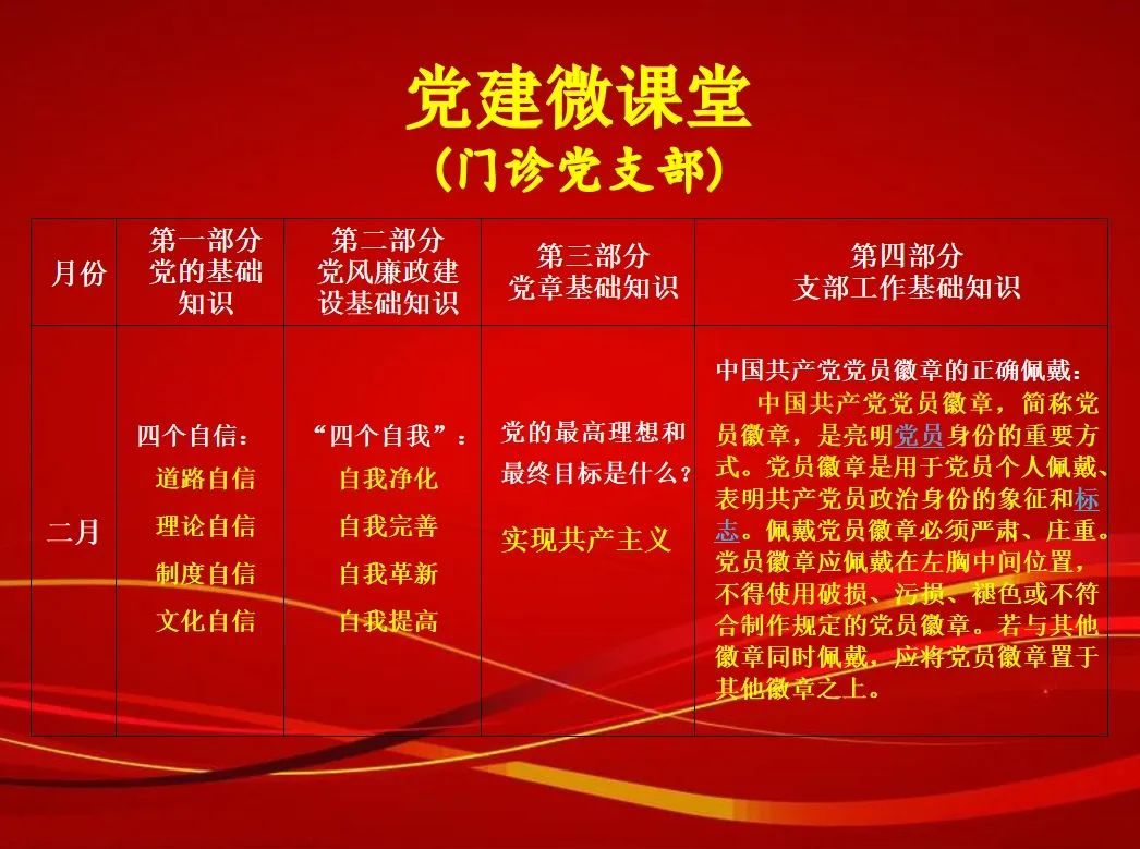 为增强学习实效性,门诊党支部精心整理了包括党的基础知识、党章基础知识、党风廉政建设基础知识和支部工作基础知识四个方面在内的党建知识应知应会,同步开设“党建微课堂”,线上线下相结合,通过主题党日集中学习、党员微信群发布等形式,将“党建知识应知应会掌上宝典”的内容传递给每位党员。党员们通过点滴学习,既加深了对党建知识的理解,又增强了学习的积极性和灵活性。
