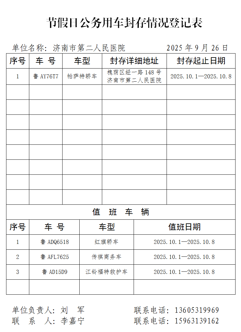 节假日公务用车封存情况登记表