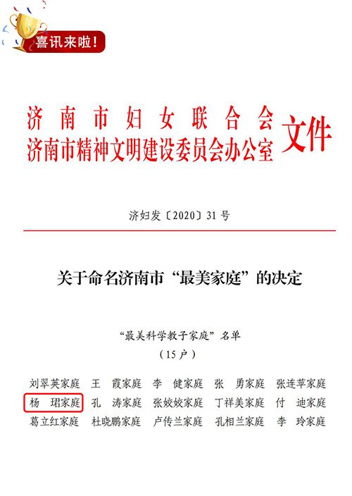 市二院杨珺家庭喜获济南市2020年“最美家庭”荣誉称号