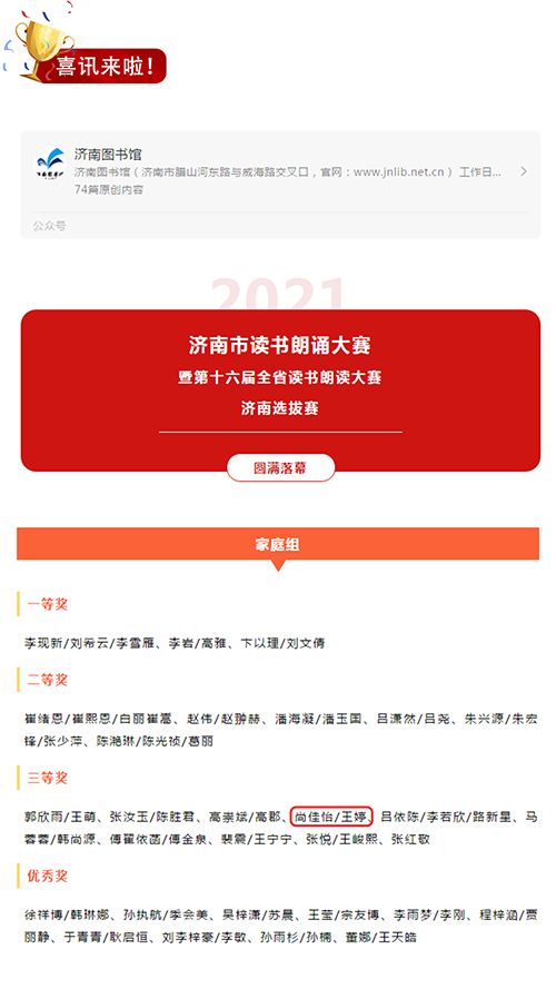 市二院王婷家庭获2021年济南市读书朗诵大赛家庭组三等奖