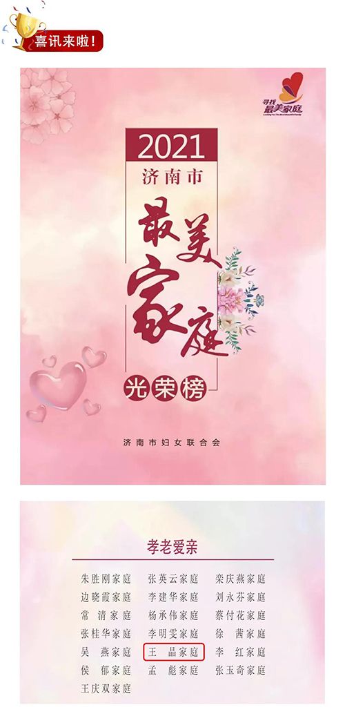 喜讯!市二院王晶家庭获得济南市2021年“最美家庭”荣誉称号