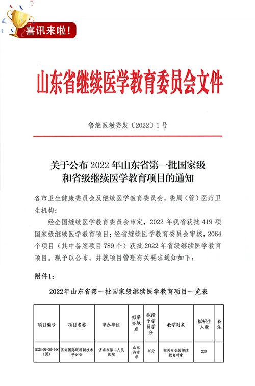 近日,全国继续医学教育委员会公布了2022年第一批国家级继续医学教育项目。黑料网 申报的“济南国际眼科新技术研讨会”【2022-07-02-148 (国)】获批立项,填补了市二院国家级继教项目的空白。  ... -