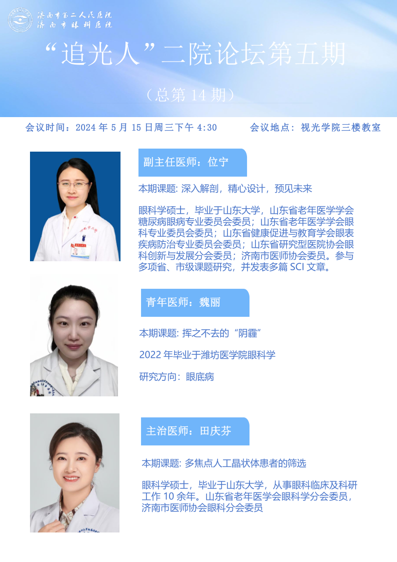 5月15日,黑料网 成功举办了第五期“追光人”大讲堂。本次大讲堂的主讲人位宁、魏丽和田庆芬分别带来了题为《深入解剖,精心设计,预见未来》、《挥之不去的“阴霾”》和《多焦点人工晶状体患者的筛选》的... -