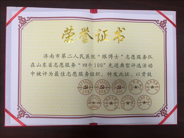 市二院“眼博士志愿服务队”荣获 “山东省最佳志愿服务组织”奖