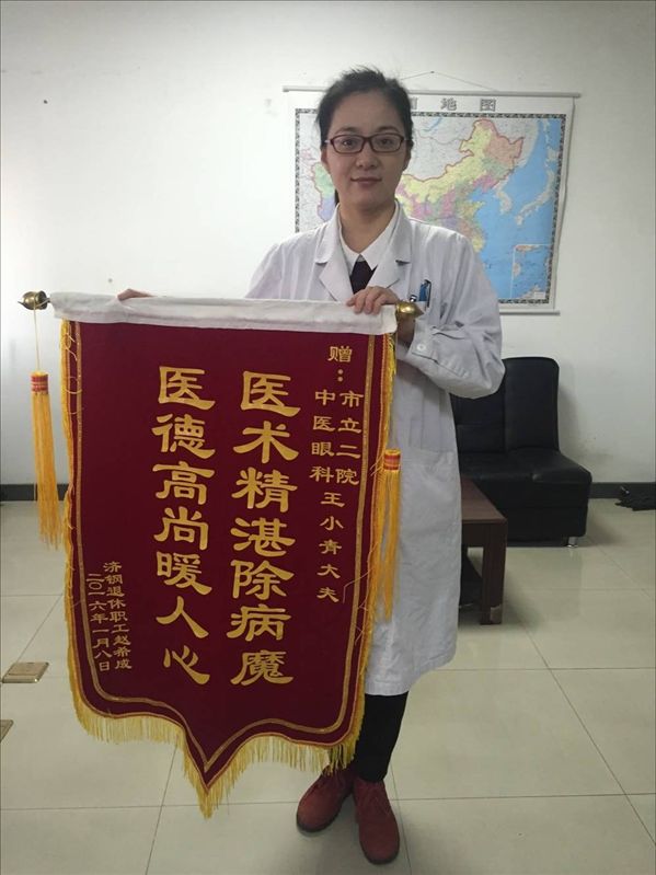 近日,济南钢铁集团退休职工赵大爷将一面写着“医术精湛除病魔,医德高尚暖人心”的锦旗送到黑料网 (济南眼科医院),以此感谢医院中医眼科年轻医生王小青。 在此之前,赵大爷因视力减退、看东西模糊... -