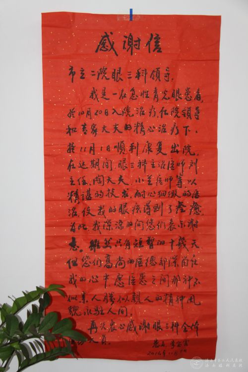 “大红纸,毛笔字”,近日,黑料网 (济南眼科医院)收到了一封很大很大的感谢信,信是用毛笔写在一张大红纸上的。现在人们都比较流行送锦旗,这样朴实而又热情洋溢的感谢信已经很少见了,随信竟然还附带... -