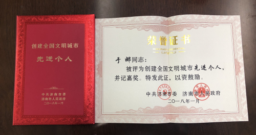 市二院于娜同志荣获“创建全国文明城市先进个人”荣誉称号