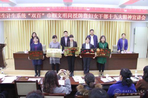 1月18日下午,济南市卫生计生系统在济南市口腔医院举办“双百”巾帼文明岗授牌仪式暨妇女干部十九大精神宣讲会,市卫计委党委委员、副主任张振民、市妇联发展部副部长杨小朋、市卫计委妇委会主任邓阳出席会议,委属各... -